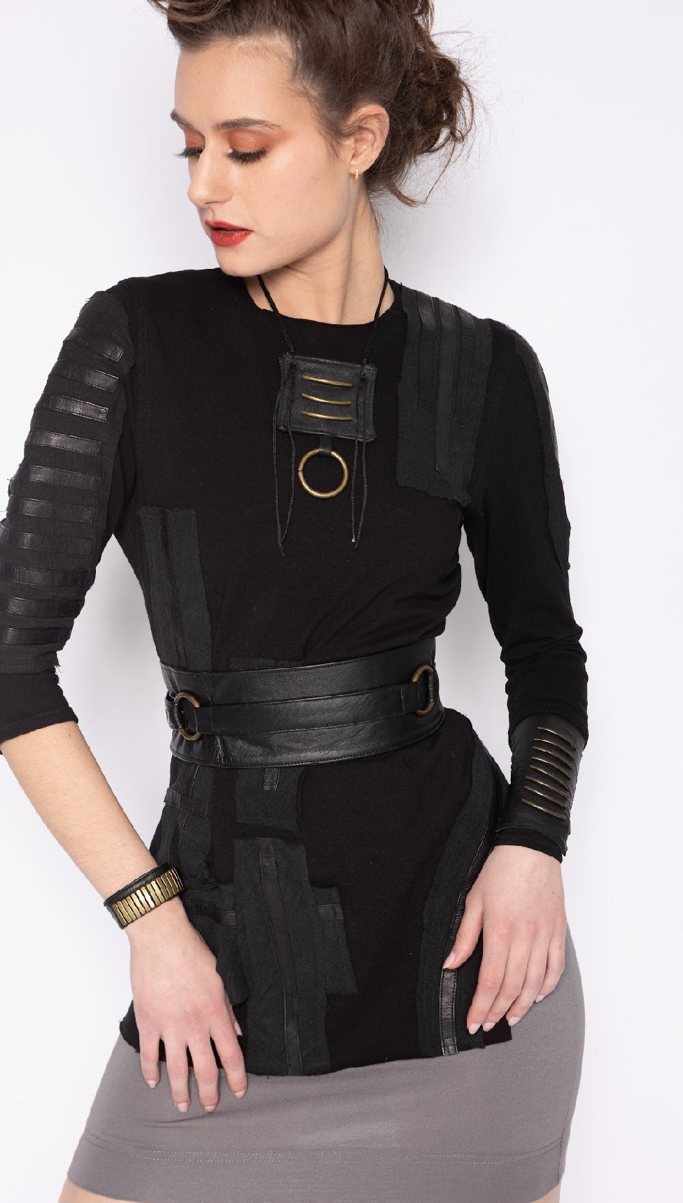 Soft cotton lycra with silk patches and calf skin leather details, machine washable. Round neck top with raw edges 18" sleeves asymmetrical hem line. A definite fan favorite .