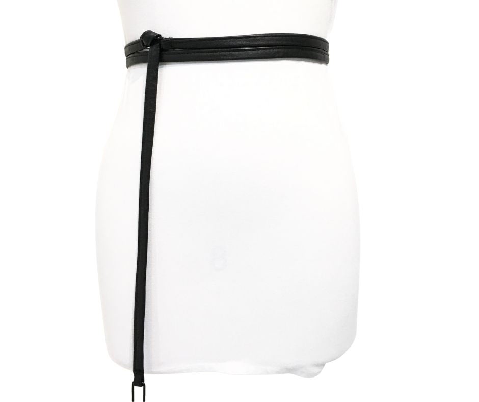 Leather wrap around belt. with metal rectangle rings on ends so that you can wear it tied or looped through rings
