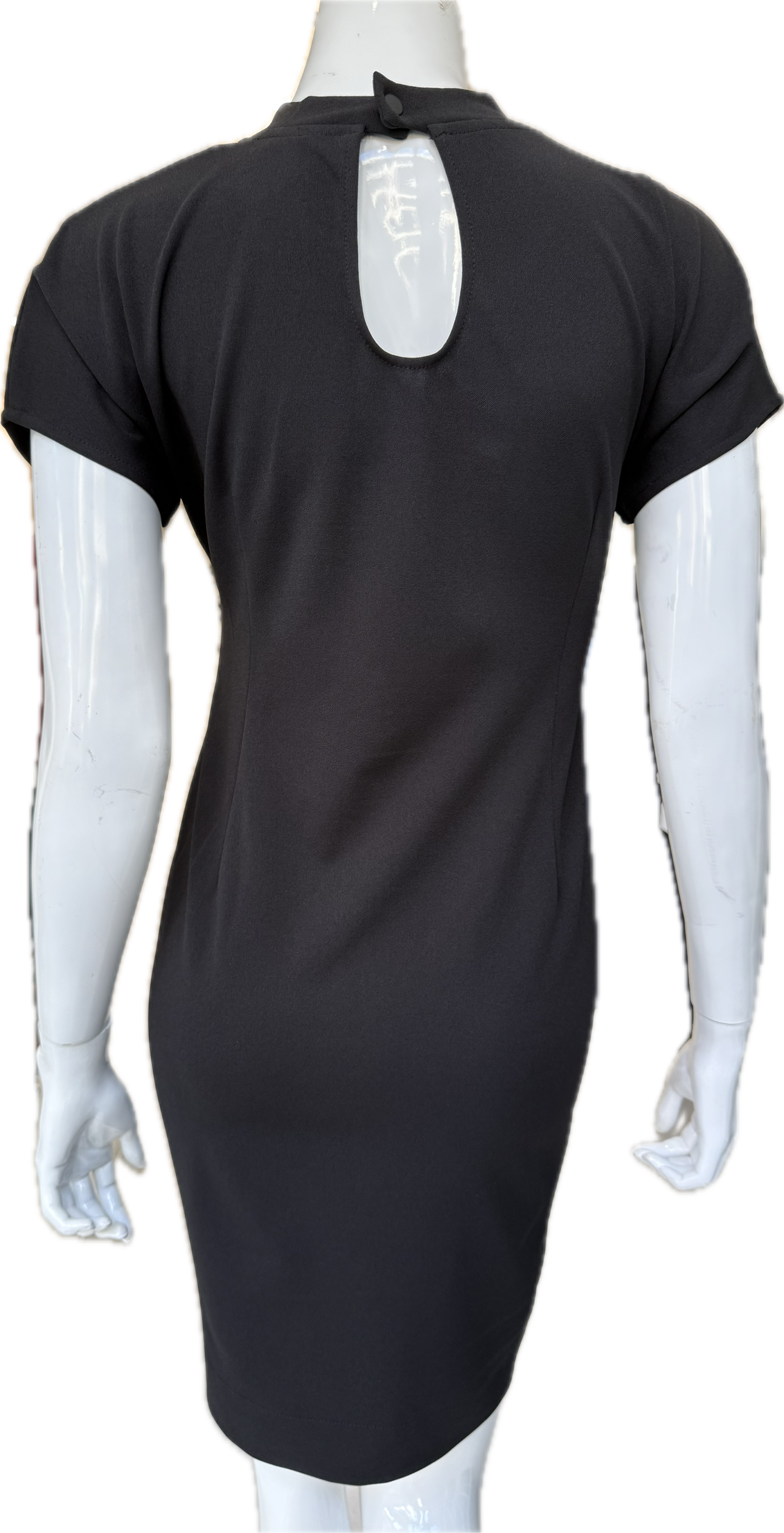Crafted from premium stretch crepe fabric for comfort and movement, this dress combines sleek minimalism with striking details. The keyhole back opening adds another layer of contemporary design, making this an essential piece for the modern woman who appreciates distinctive style. Machine washable for easy care.