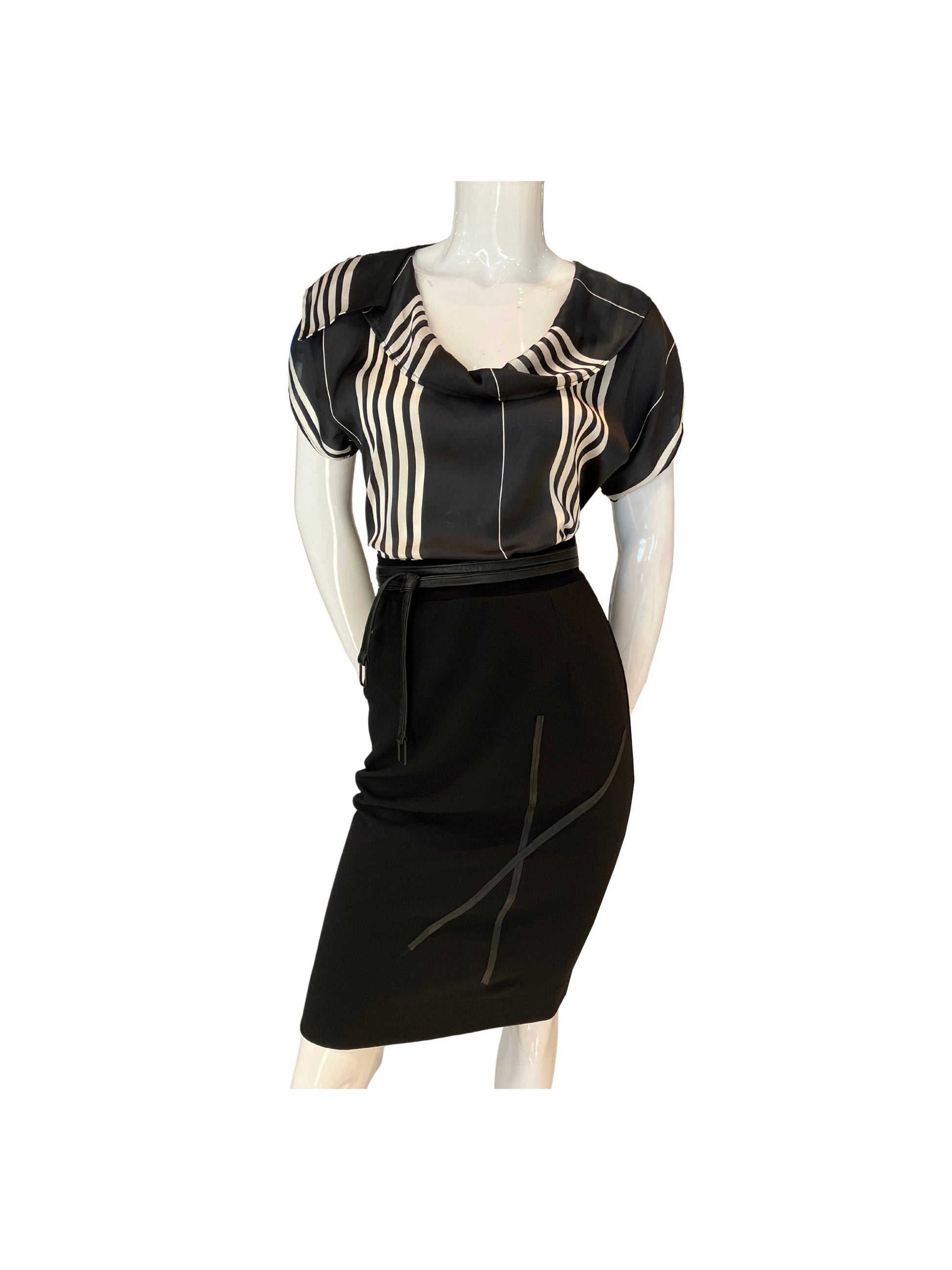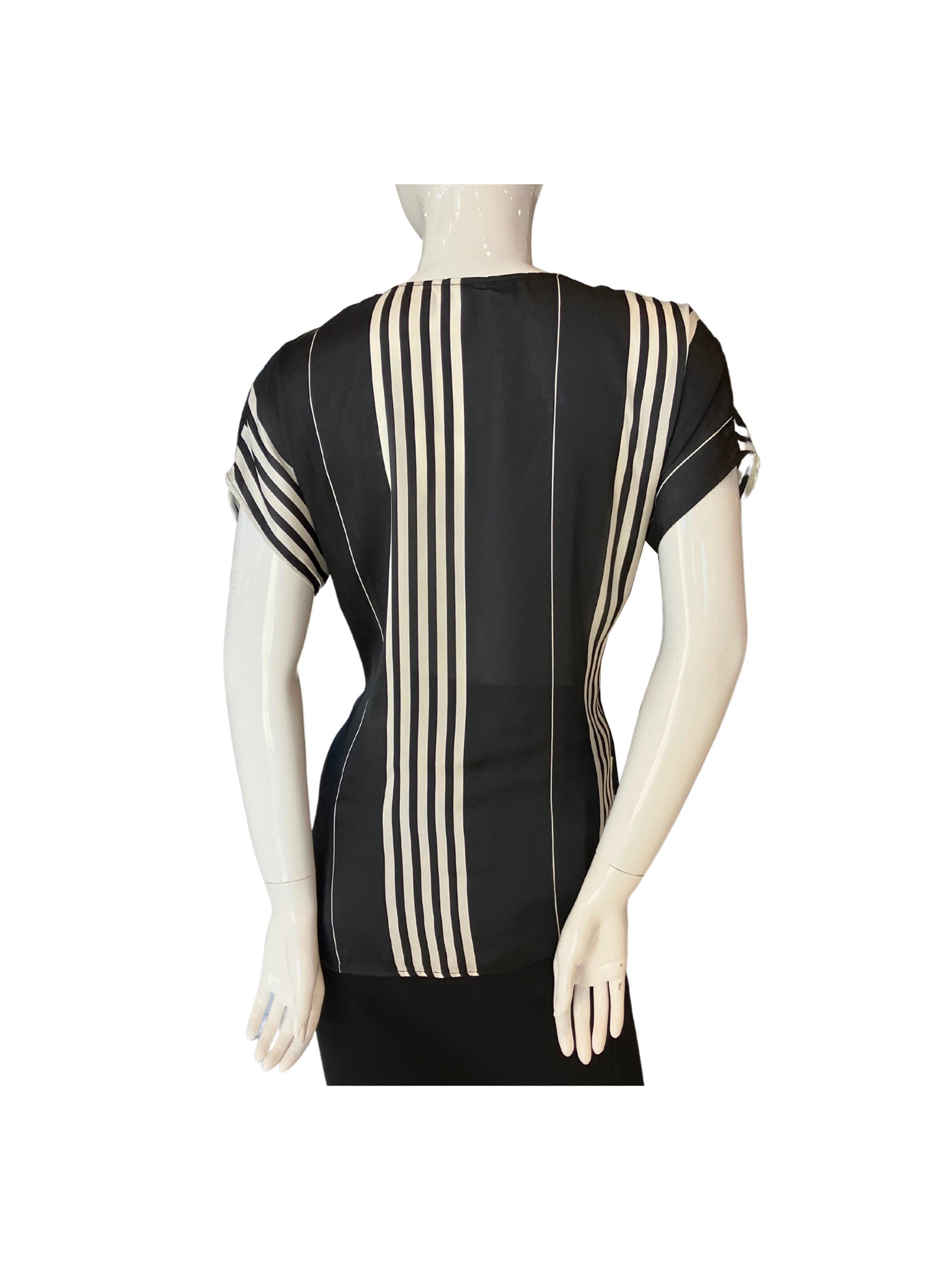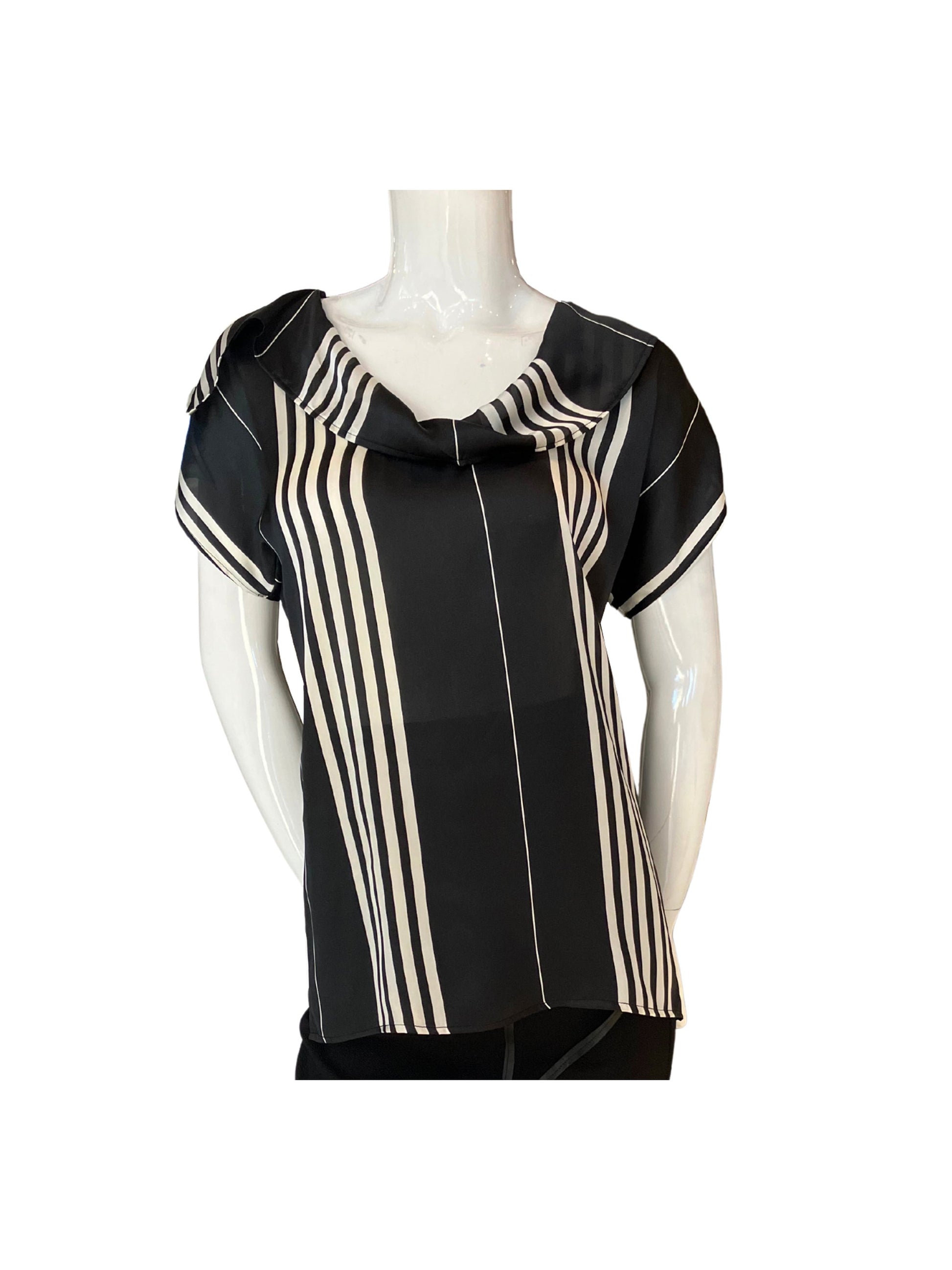 Poly satin stripe print top. Short sleeves with neckband and open slits on hem.washable